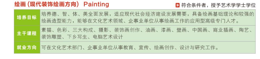 就業(yè)方向:學(xué)生畢業(yè)后主要在教育系統(tǒng)、藝術(shù)設(shè)計(jì)、編輯出版單位、藝術(shù)團(tuán)體等部門工作。