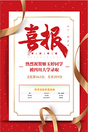 我校姬雨婷,統(tǒng)考209分,全省第7512名,逆襲美術(shù)統(tǒng)考狀元275分,被四川大學錄取。