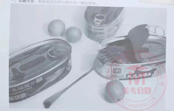 試題內(nèi)容:根據(jù)提供的黑白照片做一副色彩畫,圖片中包括三罐廣東鳳尾魚罐頭(粵花牌),其中一罐蓋子打開,三個小金桔,一把不銹鋼叉子斜放在打開蓋子的罐頭沿上。