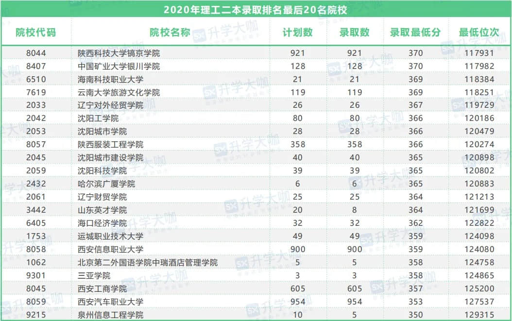 在文史類2020二本錄取排名最后的20所院校中,西安信息職業(yè)大學(xué)、西安汽車職業(yè)大學(xué)、西安明德理工學(xué)院、西安工商學(xué)院、三亞學(xué)院排在后五名。這幾所院校均屬于原三本升級(jí)為二本的民辦院校。