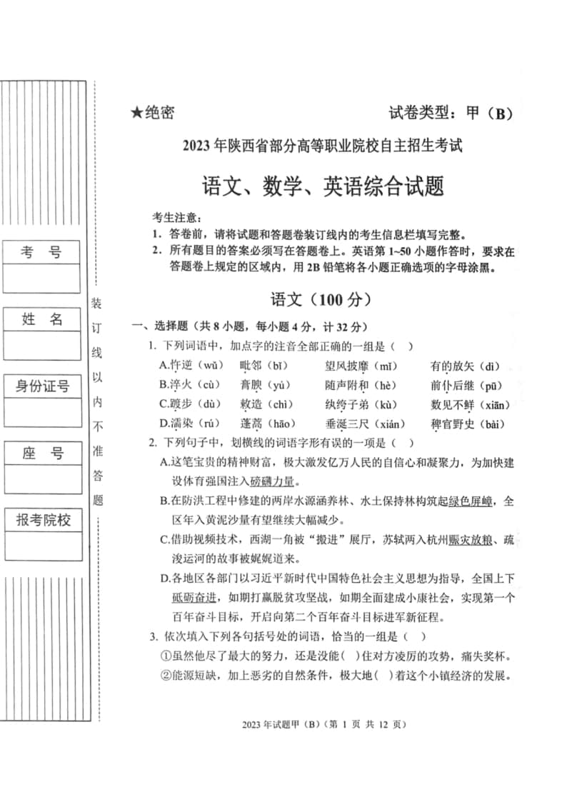 2023年陜西省高職單招語數(shù)英綜合考題甲(B)(含答案)..